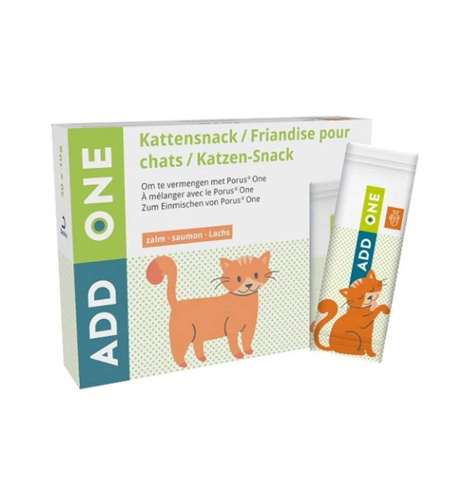 Add One Zalm is een lekkere snack voor katten in de vorm van een romige zalmsaus die rijks is aan vocht en Omega-3 vetzuren. De Add One Zalm is ook zeer geschikt voor het toedienen van de Porus One ter ondersteuning van de nieren. Add One bevat weinig calorieën, zelfs minder dan 10 kcal per stick. Deze kattensnacks bevatten geen toegevoegde suiker, kleur- of smaakstoffen en geen conserveermiddelen.