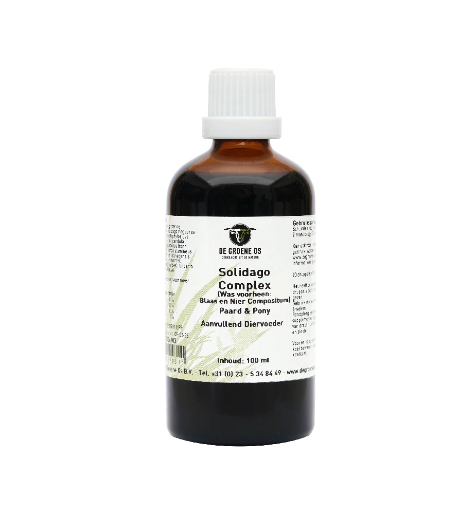 De Groene Os Solidago Complex Paard & Pony (voorheen De Groene Os Blaas en Nier Compositum) is een 100% natuurlijk aanvullend diervoeder voor paarden en pony’s ter ondersteuning van de nieren en urinewegen.